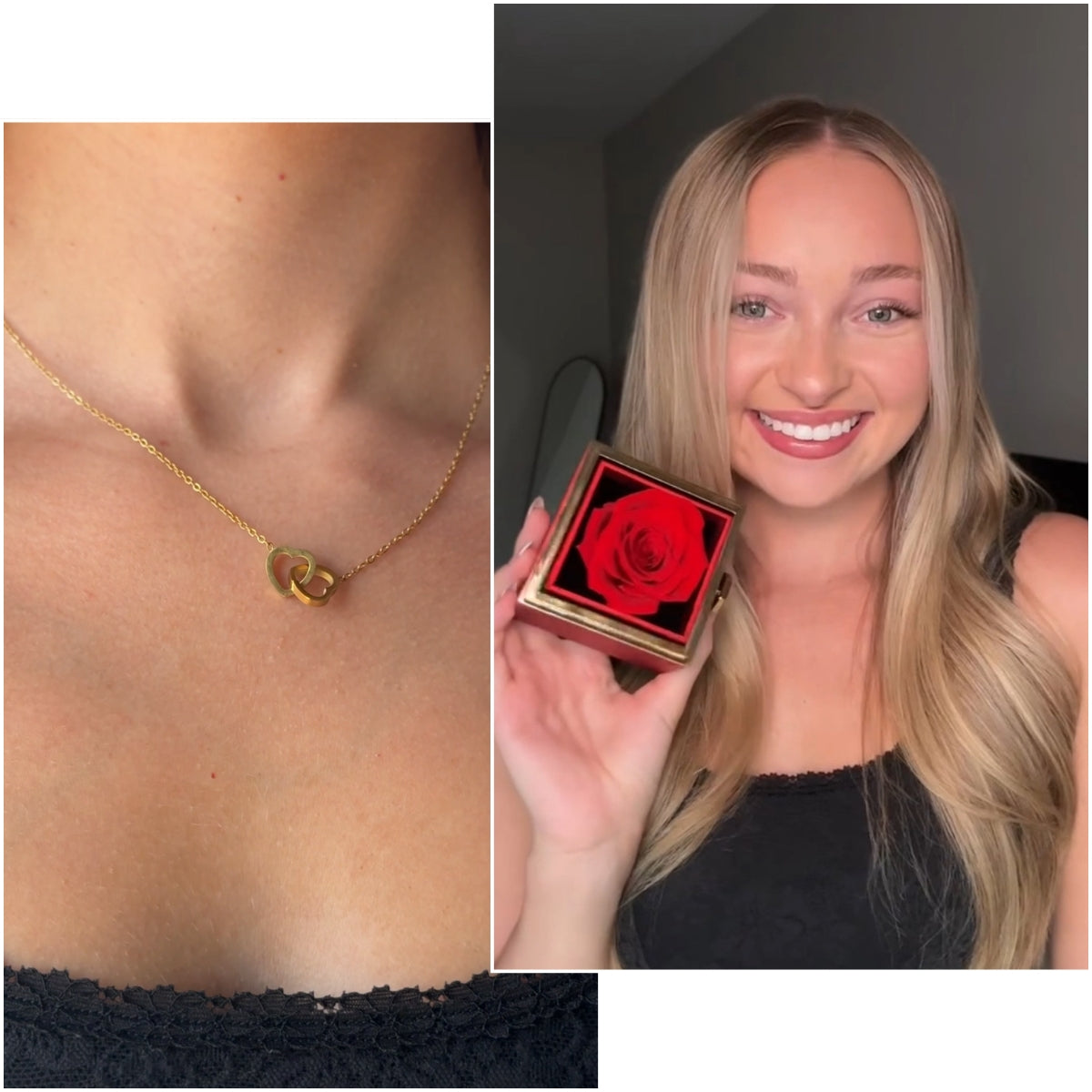 Inside every box lies a custom engraved necklace, featuring two interlocked hearts engraved with your names or initials.