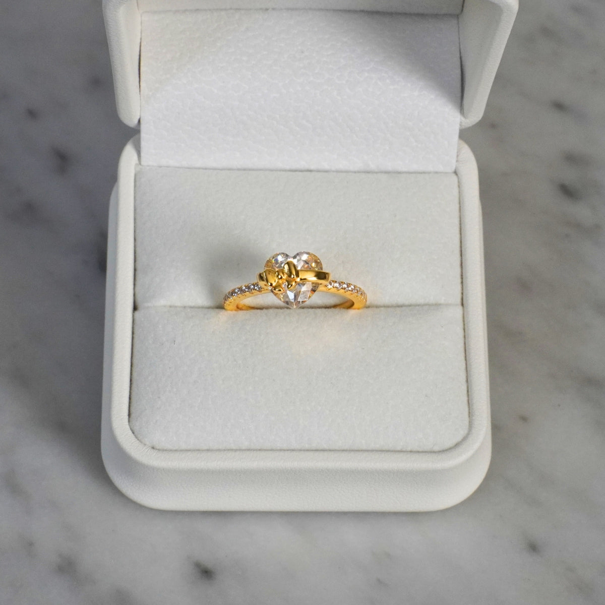 Featuring a dazzling heart-shaped center stone wrapped in an bow, this ring captures the feeling of being perfectly tied to the one you love.