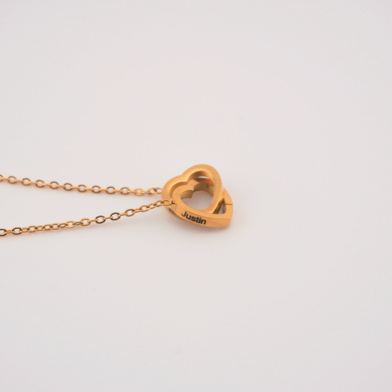 Inside every box lies an 18k gold-plated necklace, featuring two interlocked hearts engraved with your names or initials.